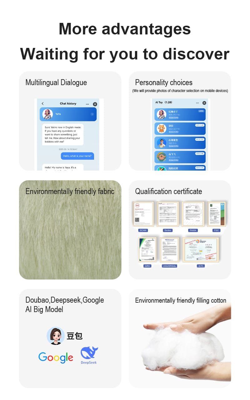 LED screens are used to replace traditional embroidered eyes, making the plush toys more vivid when talking to you. The Hug Me series AI toys will switch between multiple expressions according to the conversation scene: angry, surprised, scared, standby, happy, etc. More ways to play are waiting for you to discover!