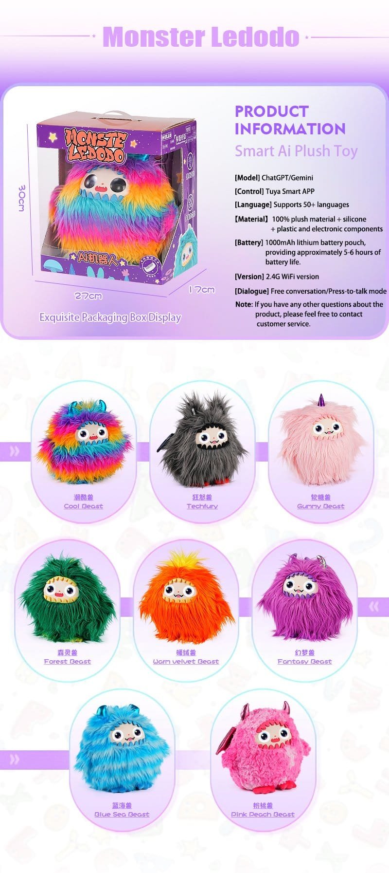 LED screens are used to replace traditional embroidered eyes, making the plush toys more vivid when talking to you. The Monster Ledodo series AI toys will switch between multiple expressions according to the conversation scene: angry, surprised, scared, standby, happy, etc. More ways to play are waiting for you to discover!