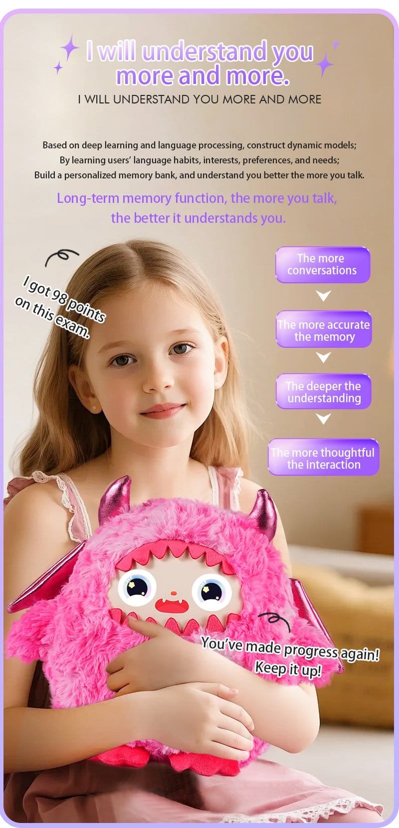 The Monster Ledodo AI plush toy has a unique feature: voice cloning. It’s common knowledge that children cry when they feel insecure, but they quickly calm down when they hear their parents’ voices. Therefore, our smart plush toy can clone its voice, allowing the parent’s voice to always be with your child.
